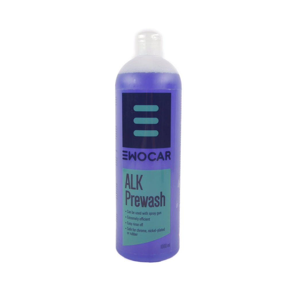 ALK Prewash från Ewocar är en förvask som kan användas för att rengöra fordon när det har blivit extra smutsigt. Produkten kan appliceras med en sprayflaska men har även en bra skumeffekt, så den kan appliceras med skumsprayer eller skumlansar. Produkten löser effektivt upp kraftig smuts, vägfilm och insekter. Trots ett pH-värde på hela 13,2 orsakar den inte fläckar på känsliga ytor som krom och plast. Fungerar också bra som en kraftig fälgtvätt.