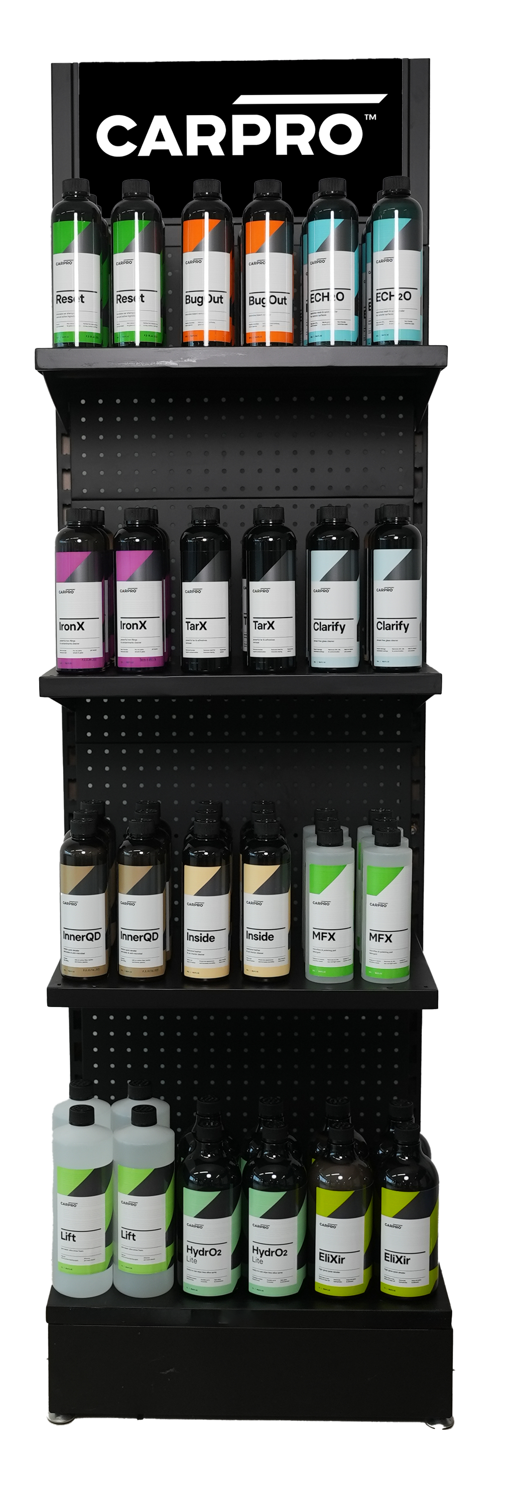 Få et professionelt produktdisplay fyldt med kvalitets produkter fra CarPro. Displayet gør det nemt for dine kunder at købe plejeprodukter efter en behandling, så de kan vedligeholde resultatet derhjemme.