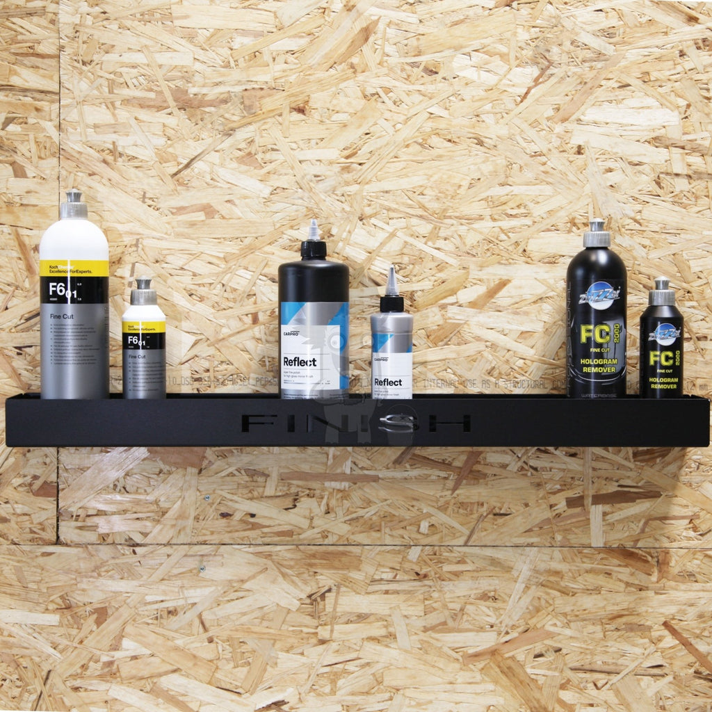 Hylden er lavet til dine fine polermidler og har indgraveret skriften FINISH. Fåes også i en version med indgraveringen Polish og Cut, blot så du er opmærksom på at hylden findes til hhv. dine grove, mellem/1-step og fine polermidler. Da hylden er 86 mm dyb, kan der stå produkter som til 1 liter. Og med hele 80 cm er der plads til en del !