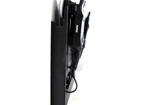 I botten av hållaren finns ett utsnitt för att organisera kablar. Gummitätningar ser till att maskinerna sitter ordentligt på plats.