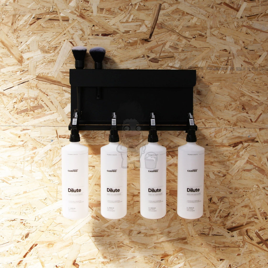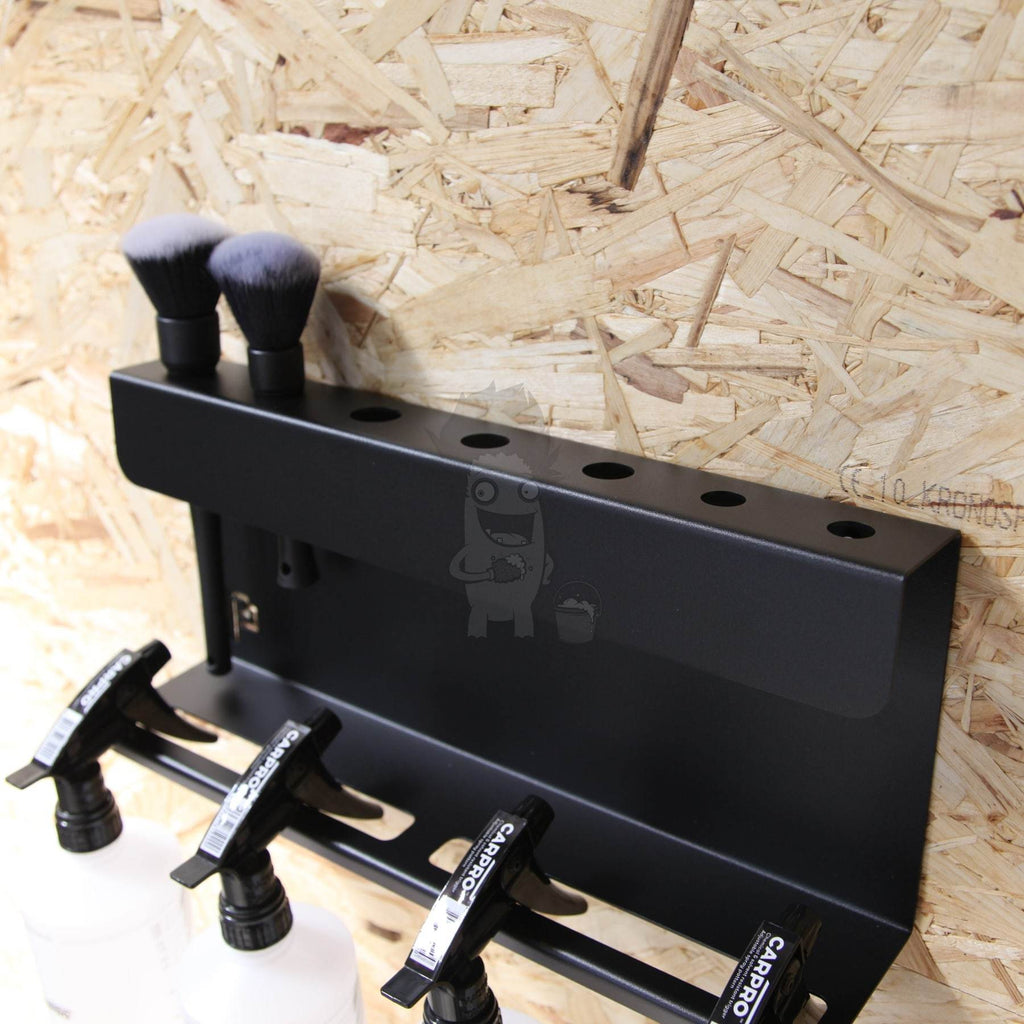 Denna vackra holder för penslar och sprayflaskor är utförd i pulverlackerat rostfritt stål. Med sina 40 cm i bredd finns det i toppen 7 hål för motsvarande 2 små och 5 stora penslar. I botten av holdren finns plats för att du kan hänga dina bilskötesprodukter. Och det är bara att fylla på. Holdren kan bära över 10 kg!