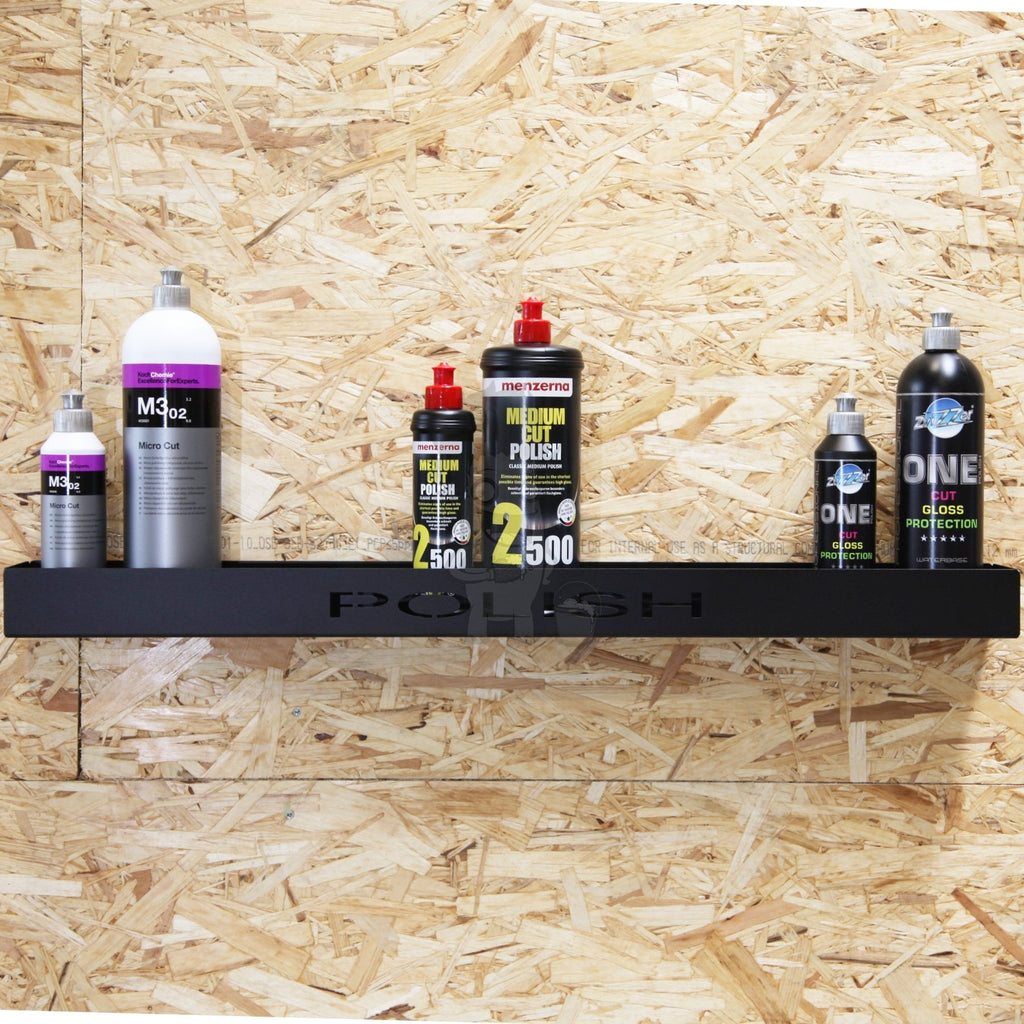 Hyllan är gjord för dina polermedelär och har ingraverad text "Polish". Finns även i en version med ingraveringen Finish och Cut, bara så att du är medveten om att hyllan finns för dina grova, mellan/1-stegs och fina polermedelär. Eftersom hyllan är 86 mm djup kan det stå produkter på upp till 1 liter. Och med hela 80 cm finns det plats för en hel del!