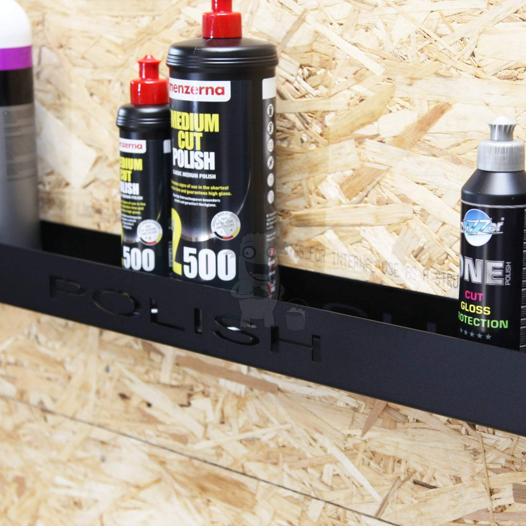 Håll dina produkter organiserade med denna fina hylla för förvaring av polermedelär. Hyllan är utförd i Poka-stil med pulverlackerad rostfritt stål på alla kanter och sidor. Det betyder att den är mer motståndskraftig mot spill - från kemikalier som står på hyllan. Ser fantastisk ut i vilket garage eller verkstad som helst. Har ingraverad POLISH